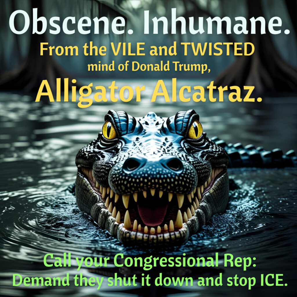 Meaning: If karma is real, Trump–and ALL his goons and enablers–will get what they deserve. They’ll be sent to their own hell-hole: Alligator Alcatraz.
